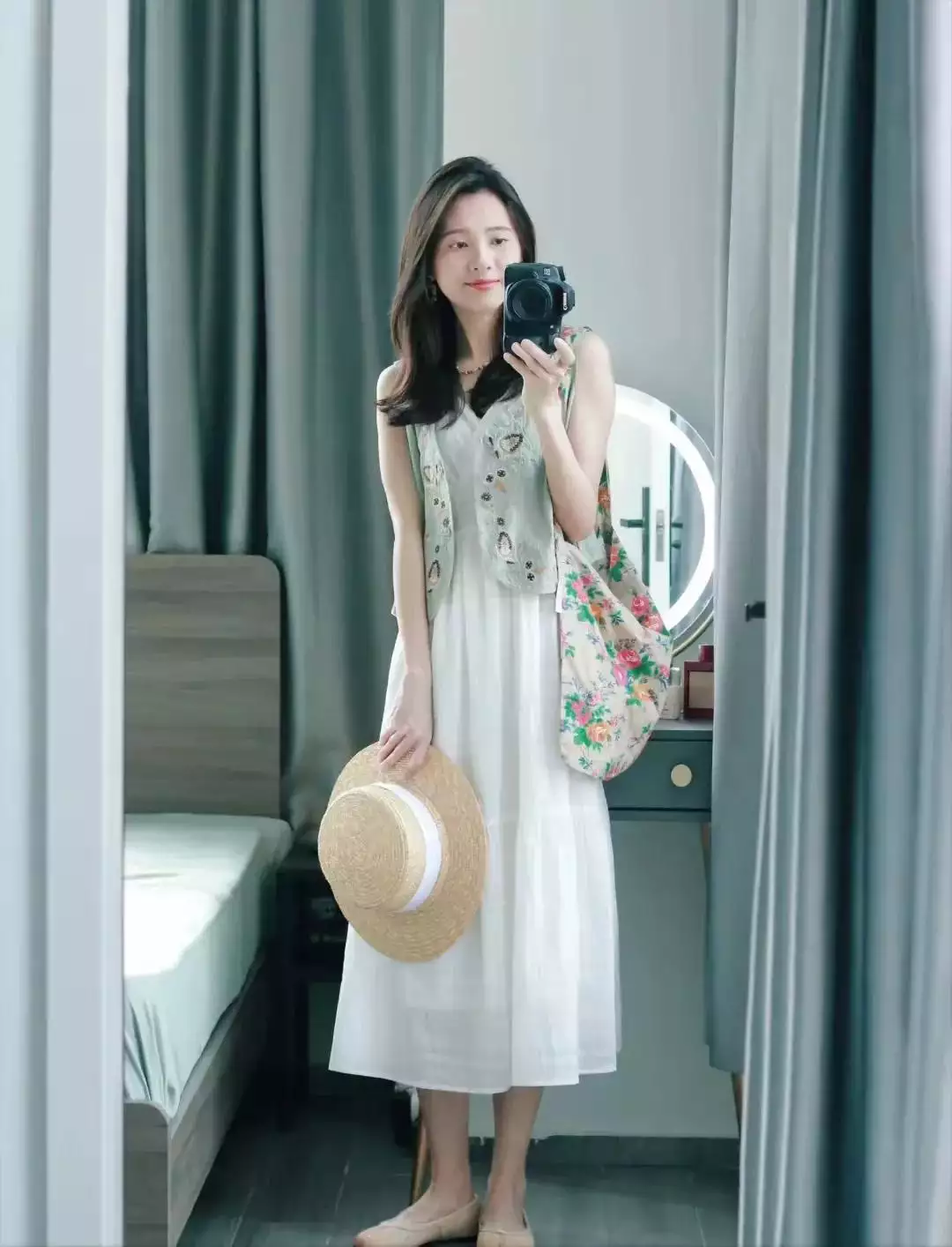 如果是出门旅游拍照,对于中年女性来说,直接一件黑色的无袖连衣裙搭配上一款草帽和精致的耳坠,拍出来的照片就很出片。