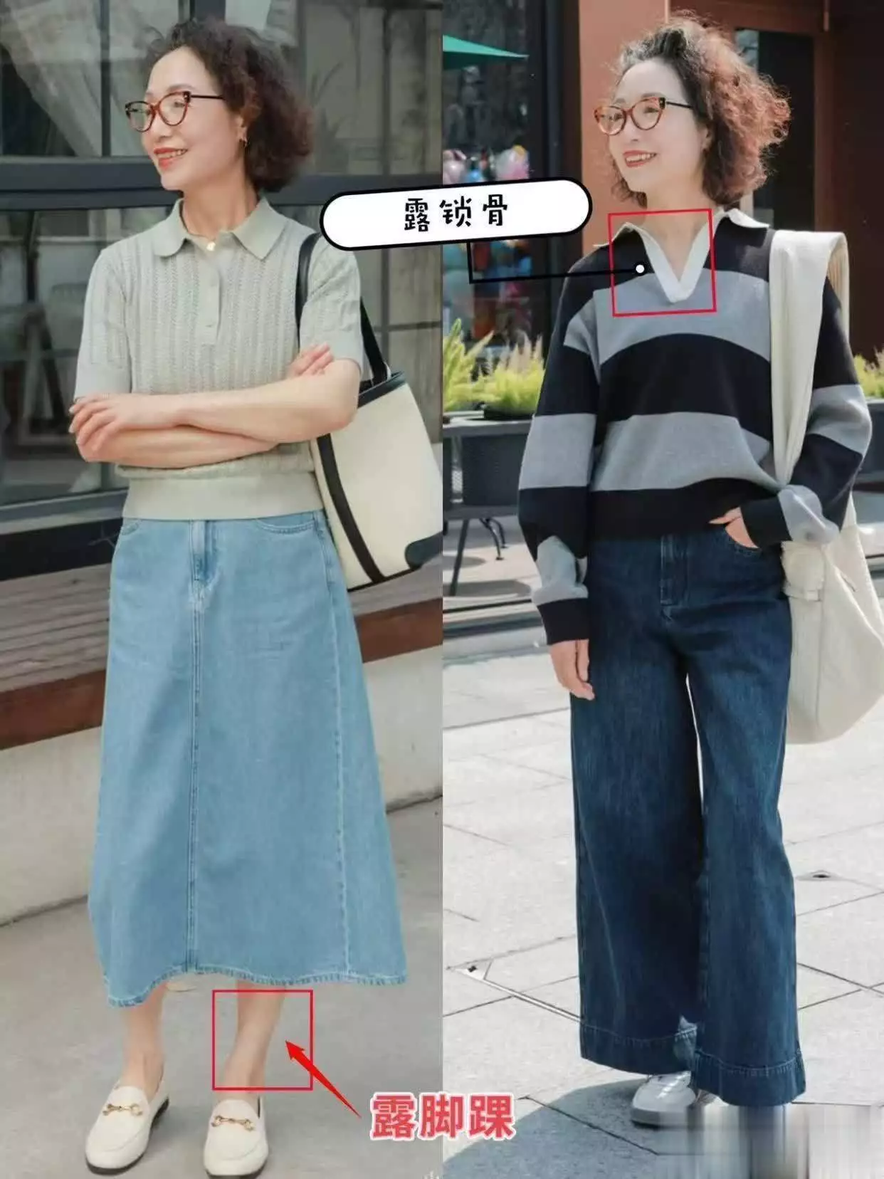 虽然说50岁左右的中年人在搭配中需要强调留白,但之前提到的三处留白并不是每套搭配都需要用到我们只需要保证在搭配中至少有两处留白,就已经能达到理想效果啦!比如在这两套搭配中,就分别选用了腰腹和脚部,手臂和脚踝作为留白,不管配裙还是配裤,都毫不耽误我们的气质美~。