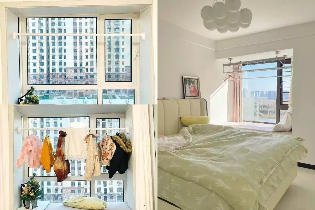 卧室门后基本都会有一部分空间,哪怕只有十公分的宽度也可以安装一些挂钩或者置物架来收纳次净衣,也不会影响开关门;虽然有点不太美观,好在是在卧室内,只有自己能看到也就无所谓了。③飘窗上