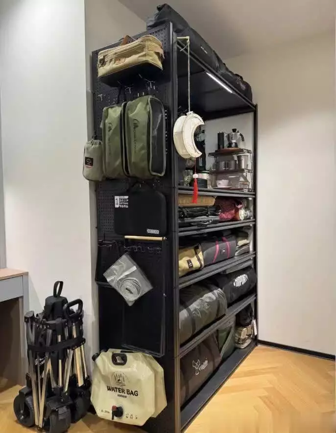 利用铁艺货架搭配洞洞板,实现家里的户外露营用品的集中收纳