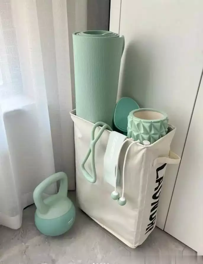 常用的瑜伽垫以及少量健身器材,专门采用带滑轮的收纳筐,平时找个角落单独放置,使用的时候很轻松就可以移动