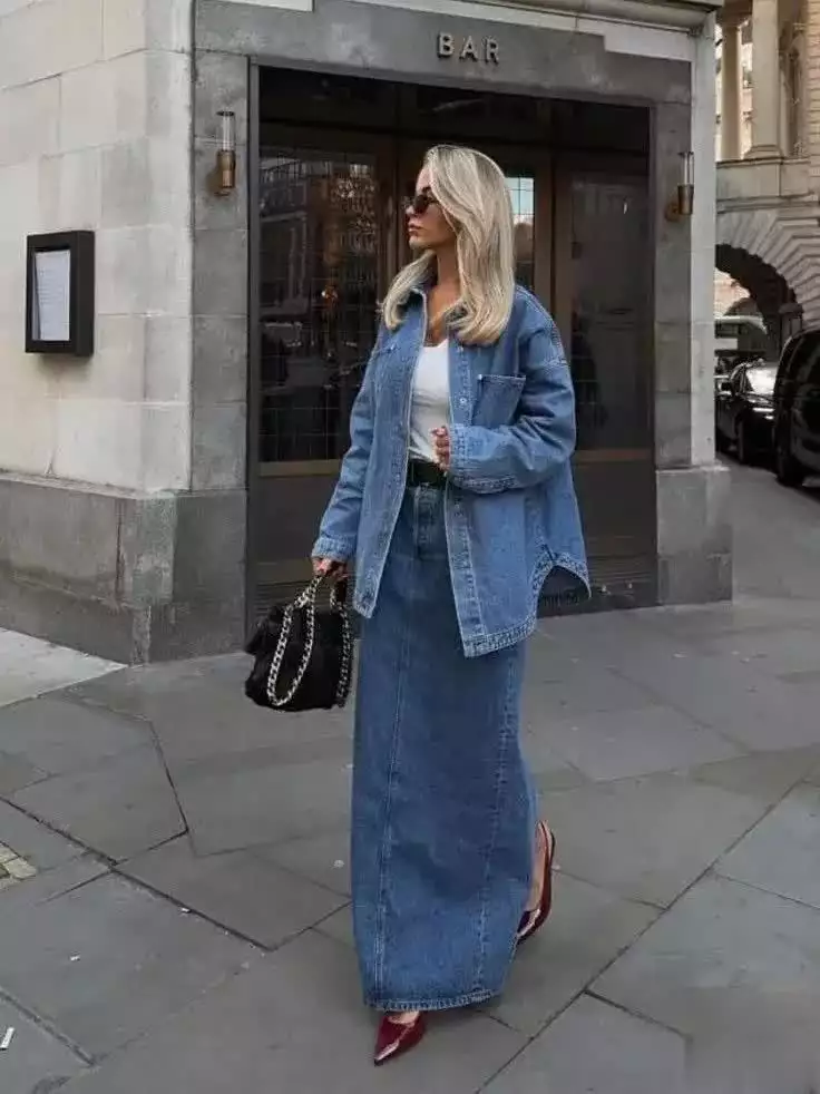 超长及地裙今年流行的牛仔长裙,款式更长,鱼尾裙摆的设计对身材修饰性极佳,几乎适合所有人。