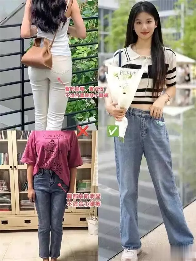但是身材比例不是很好的情况下,还穿紧身款的牛仔裤,紧身裤的话会容易暴露腿部的缺陷,不适合穿这种小脚裤,反而选择阔腿裤,直筒裤,西装裤或者是烟管裤来搭配最佳。