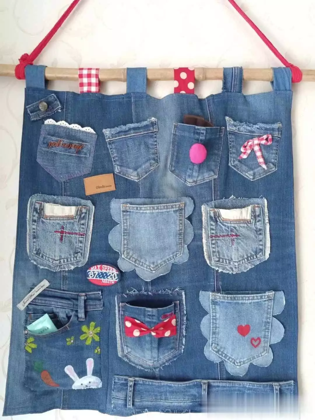 05旧牛仔裤改造成收纳墙挂如果大家家中有闲置的旧牛仔裤,可以将其简单的改造一下,变成一个收纳墙挂,用来放置一些零碎的小物件,既方便又实用。