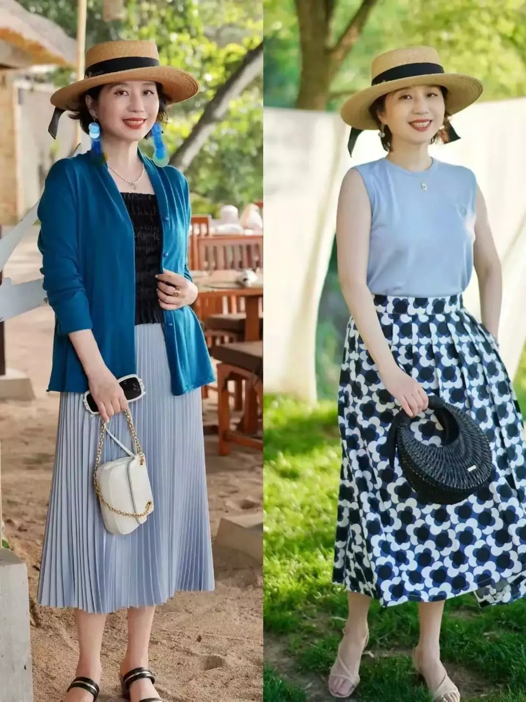 在穿衣打扮方面,半身裙可以以各种上衣进行组合,不同的款式穿出来的效果有很大的区别,例如下面用一件蓝色的针织开衫搭配上雾霾蓝的百褶半身裙,加上一款草帽,营造出来的效果清新典雅,又显得优雅得体,真的很符合中年女人。